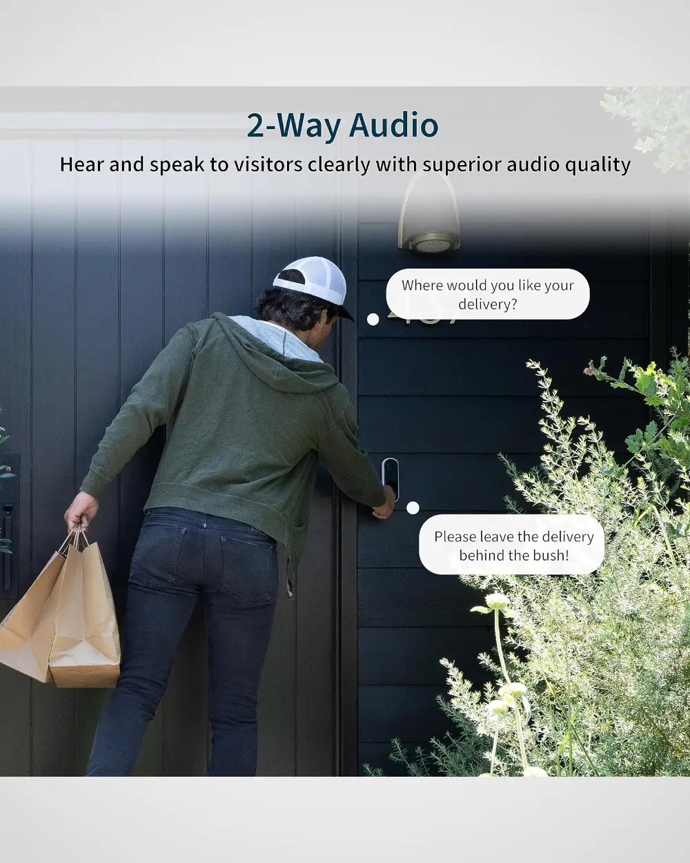 - 2-Way Audio: See and speak to visitors with clear two-way audio, or respond with pre-recorded quick reply messages when you’re busy. Receive a video call when your video doorbell is pressed and never miss a visitor.