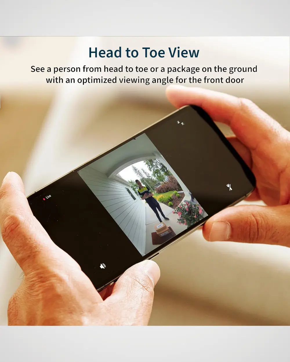 - 1:1 Ratio View: See a person from head to toe or a package on the ground with an optimized viewing angle for the front door.