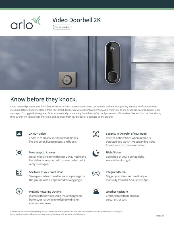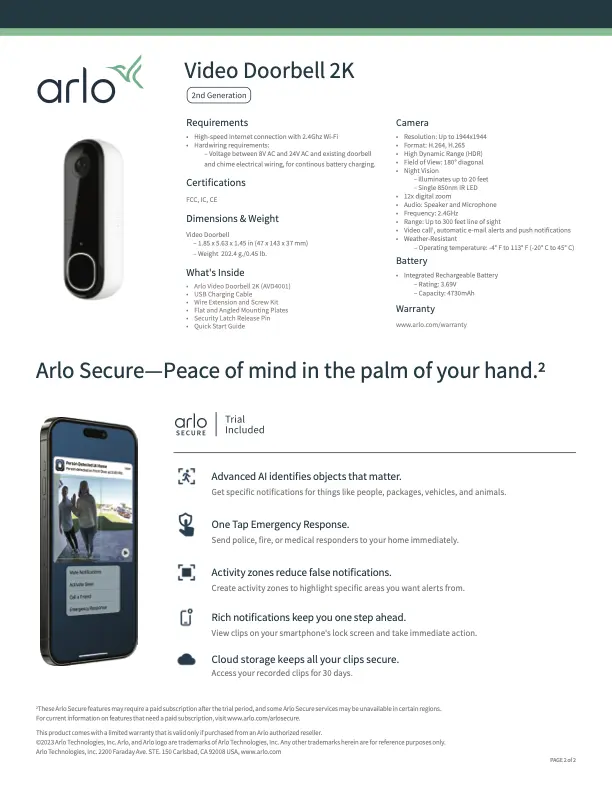 - Smart Alerts: Get alerts when your Video Doorbell spots people, vehicles, animals, or a package with Arlo Secure. Includes a trial of Arlo Secure service, with rolling 30- day cloud recordings.