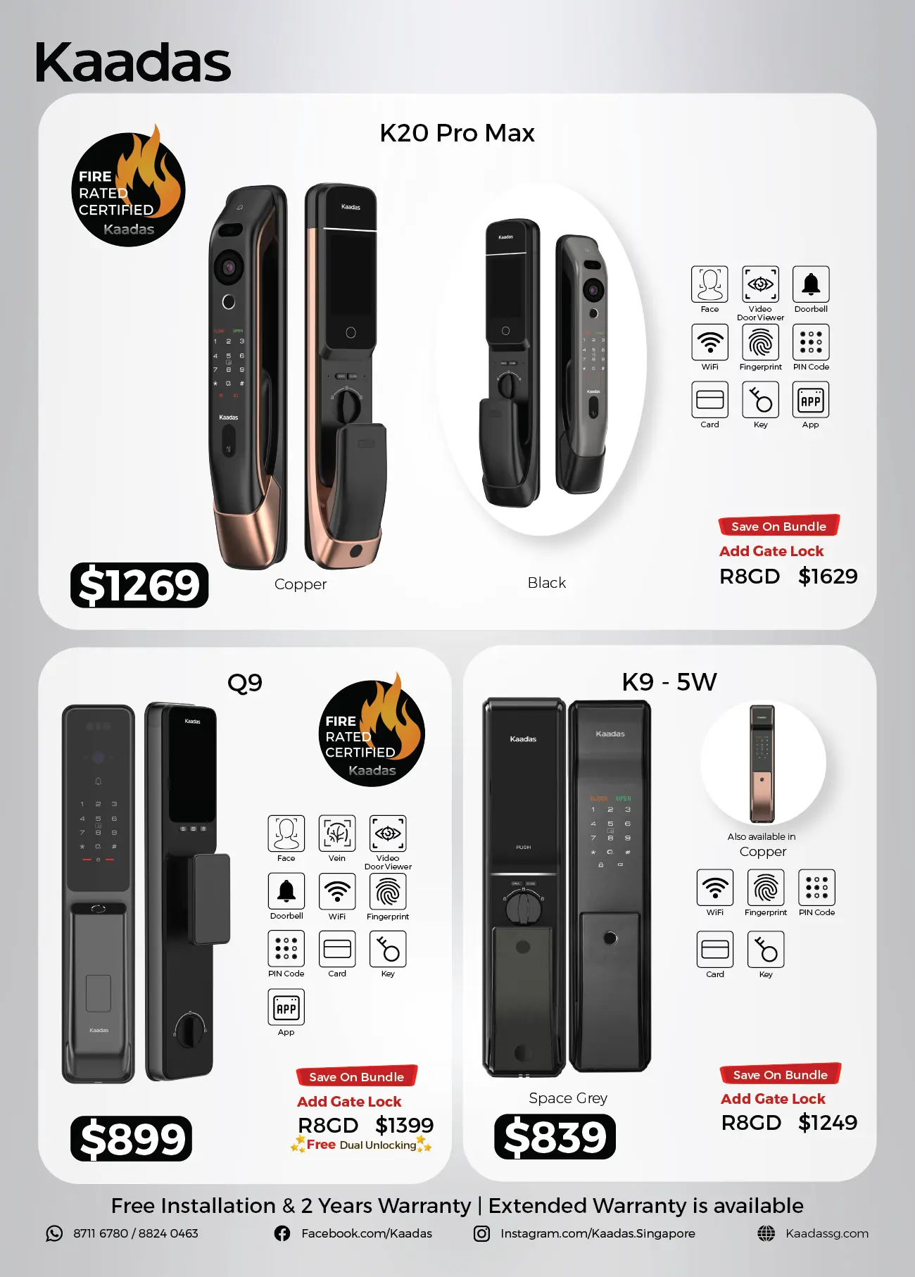 Similarly, when you purchase our gate lock, you have the option of bundling it up with any of our digital door locks at promotional prices. Take your pick from our wide range of sleek and functional digital locks – we have everything from futuristic designs like the K20 Pro, K20 Pro Max, and the Kaadas K9 to compact and affordable options like the Kaadas L7 and Kaadas R8.